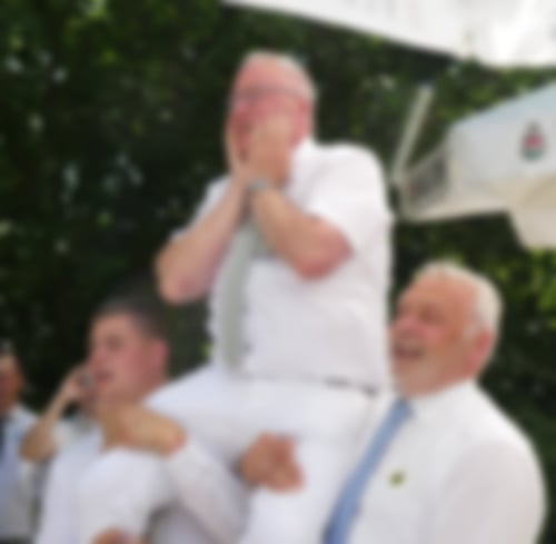 Adjutant Daniel Witte, Ehrendame Joelle Ragusa, Königin Birgit Daldrup, Fahnenoffizier Lukas Hüning, König Markus Daldrup, Ehrendame Franziska Daldrup, Oberst Christoph Wiesmann und Adjutant Luis Mennigmann.